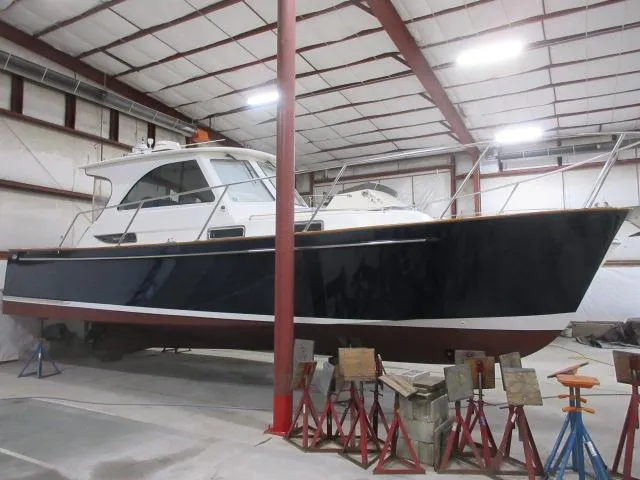 The Legacy 34 Sedan achieves a more workmanlike look that's clean and capable. Either way, the living space in the enclosed main saloon offers a 360-degree view from every seat in the house. White Formica offset by mahogany, teak, or cherry woodwork and cabinetry give the boat's living space a crisp, nautical feel. A starboard door provides easy access to the sidedecks for docking and the aft door gives access to the cockpit. Down in the galley of Legacy 34 Sedan there's plenty of light and convenient prep space. Directly across the companionway is a roomy head, and the master stateroom's double berth is island-style so it offers the comforts of home. Beneath the sole of the main saloon is a generously sized engine compartment that houses either single or twin diesel engines. The Legacy 34 engine compartment is well thought out with plenty of elbow room and convenient access to maintenance points. To keep it well organized and safeguarded, wiring and hoses are run through conduits. Engine beds have been flexibly configured to accept a variety of popular engine sizes. The Legacy 34 Sedan's ride is soft, and roll is dampened significantly; she tracks well even in cross or quartering seas, and she corners with astonishingly little heel. But more importantly, while many planing hulls have to run at high speeds to achieve plane and level out the bow, the Legacy 34 lifts onto a plane at just 12 knots. She runs at a shallow angle, affording her helmsman consistently good visibility no matter how much throttle is applied, and her underbody configuration allows her to go faster while using less fuel.