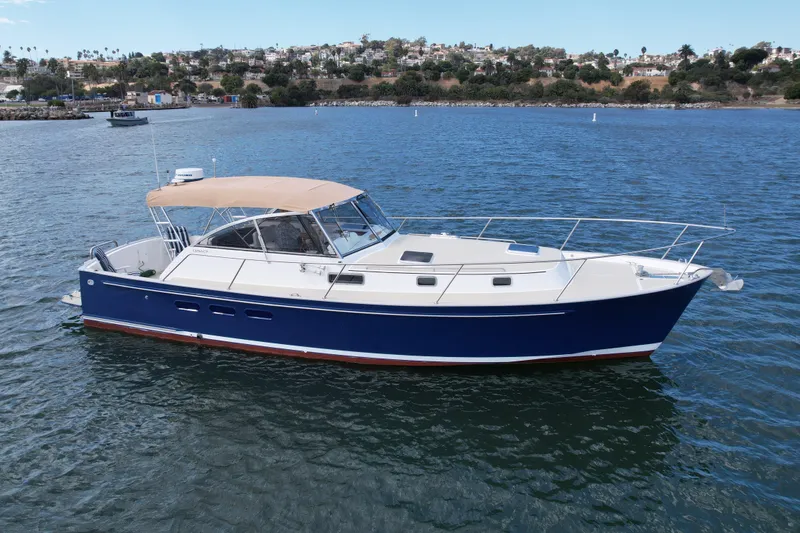 Her traditional lobster-boat hull with round bilges and a full keel delivers a stable, comfortable ride while sipping fuel at cruising speed. Powered by twin Cummins 330s, she's both reliable and efficient-ideal for extended coastal cruising or weekends to Catalina.