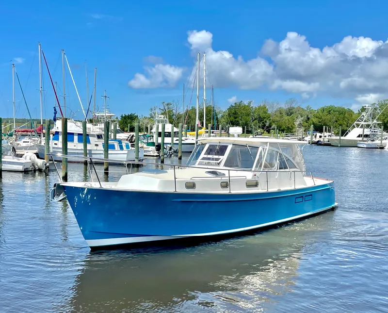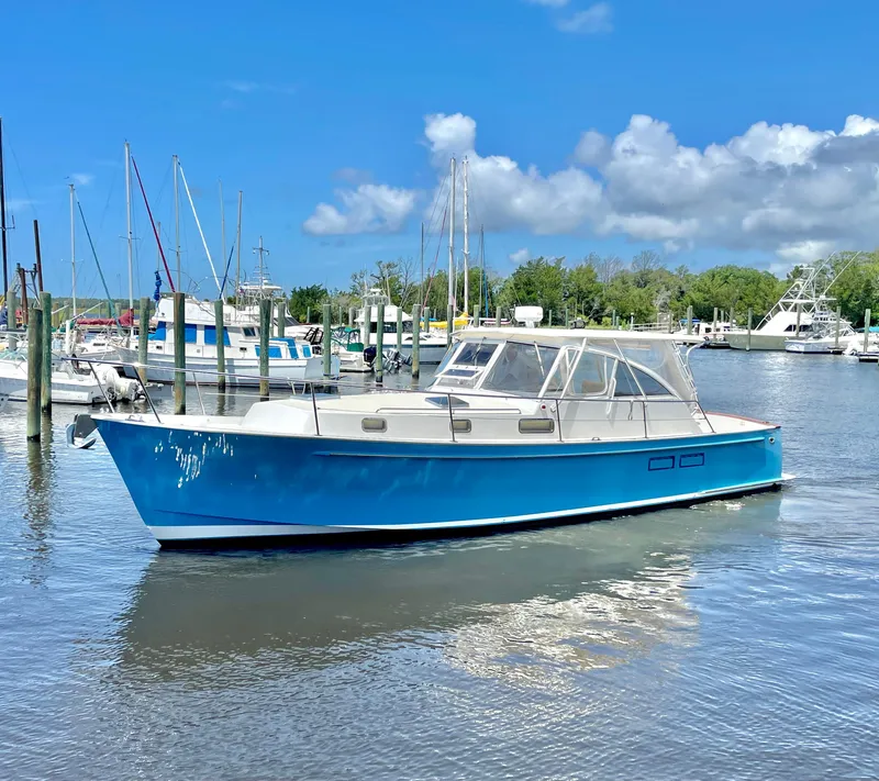 "Shay M Less" is a 1997 Legacy Yacht 40' with a proven hull and classic Down East look that sips fuel at cruise. The 40' Legacy rides like a traditional lobster yacht hull with round bilges and a full keel.