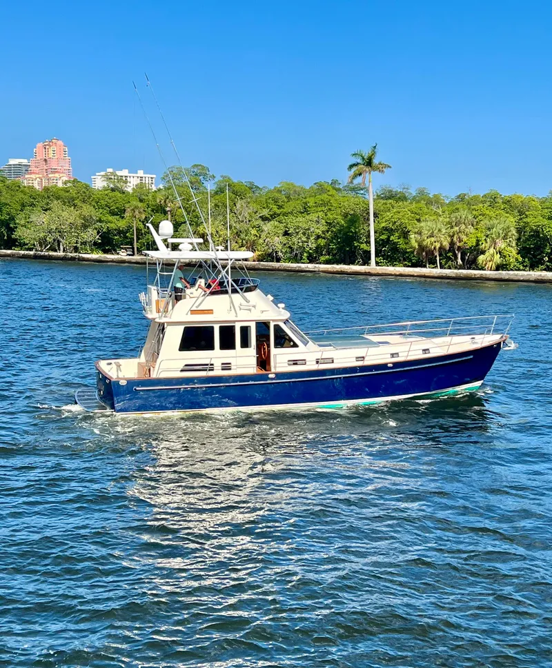 Edmond Dantes Downeast Styling, outstanding performance and state of the art systems will certainly turn heads. She boasts a recent paint job and her vibrant blue hull is beautiful. Her very low hour MAN 1050hp diesels provide exciting performance with cruising speeds in the high 20 knot range and maximum speeds well above 30 knots. She is an excellent sea boat and offers a great ride! Service is up-to-date and 1000 hour service has been completed.