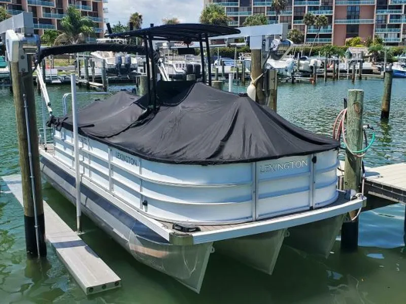 2022 Lexington 521 Tritoon powered by a Suzuki 150 HP four stroke engine with approximately 66 hours. One owner, lift stored. No bottom paint, no trailer. Unique layout with a center console and t-top. Rear sun lounger, forward captains' seats, center console with forward seat, ski tow pylon, Power Pole rear anchor, Hummingbird GPS/Sonar, fresh water system.