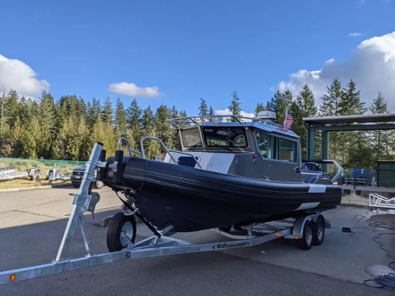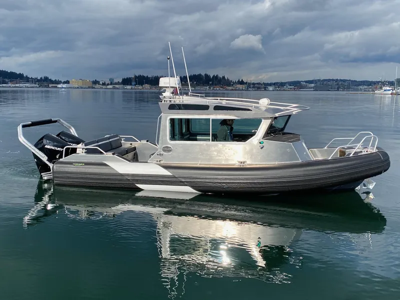 The concept for the vessel's design was a sleek, efficient cabin with suspension seating for two passengers, along with comfortable pleasing spaces throughout. This layout features comfortable benches in the cabin and dual-seat/storage space forward. The aft deck features a substantial bench spanning the transom, two aft facing seats, a pot puller location, two downrigger mounting plates and Scotty Downrigger outlets. This boat has a Garmin Radar 18xHD and a searchlight along with standard navigation lighting. The dash has no shortage of technology with the operator having a dedicated Garmin 1242 Chart plotter, engine gages, wiper and bilge controls, as well as a full lighting switchboard. The copilot dash features your searchlight controls, the AIS receiving Garmin VHF, a Hertz AM/FM Bluetooth compatible stereo, Webasto Heater controls, a diesel tank gage, and USB charging ports! Driving this boat is a breeze with twin Mercury 200hp outboards with dual engine power steering. This boat features the IMS folding dingy rack that protects your engines and also allows for the storage of small boats/boards. An upgraded stereo system featuring four speakers inside and two out is installed on this vessel! Anchor with peace of mind with this boat's Lonestar Drum Windlass and anchor package, the Ultra Marine Swivel Shackle will ensure your anchor will easily return to its storage shoot. This bow showcases the Life Proof drop bow door with a swim ladder for easy pick-ups, swimming, or loading on and off a beach! An additional swim ladder is also located on the starboard side transom.