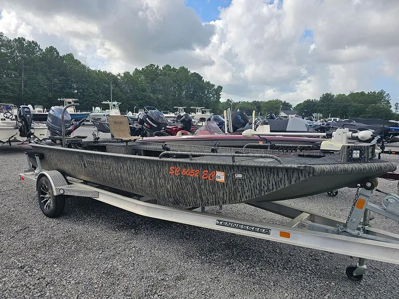 This camo Lowcountry Boats Swamp Fox 1854 Layout A has a Yamaha F70LA outboard motor and Tennessee trailer.