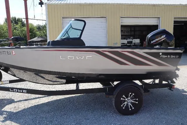 2022 Lowe FS 1700 Fish & Ski, Price includes a Mercury 115EXLPTEFI 4-stroke with 1.7 hours and factory warranty until 03/26/2025, upgraded Karavan trailer with Mag Wheels and swing tongue, spare tire, Minnkota 70lb PD, Lowrance Hook 2 4 X fish locator, Deck hand electric anchor, tilt steering, chrome accent steering wheel, ski pylon, bow cushions, rails and combing pads, vinyl cockpit only, two bank charger, bow trim switch, Jensen stereo with 4 speakers, swim platform, factory cover, and batteries. Color is Metallic Black with Silver Accent.
