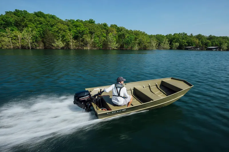 The strong and stable aluminum Lowe L1448M Jon provides lasting performance and superior value in an affordable package. Enjoy features like a center seat with livewell/storage compartment, two strong lifting handles, and a Mod-V bow, flat-bottomed hull design for a smooth, dry ride.