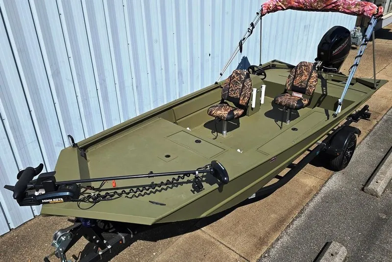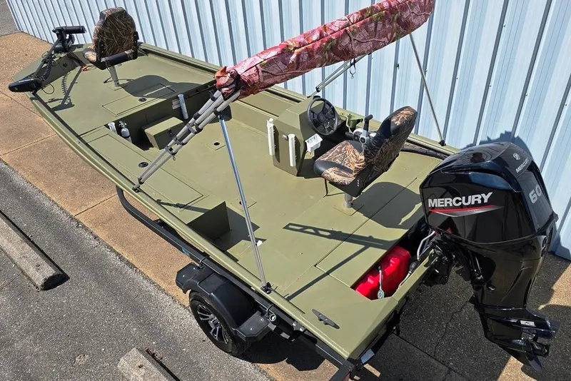 2022 Lowe Roughneck RX1860 Rambler (18' X 85"/60" Bottom Width), '22 Mercury 60 HP 4S EFI, 2022 Karavan single axle bunk trailer with fold away tongue, load guides, Aluminum mags, transom Tie down straps, spare tire & mount. This is a heavy duty all welded Aluminum fishing/hunting boat. The color is Green with Mossey Oak Shadowgrass Green Camo seats. The floorplan has a single side Mount steering console with elevated casting platforms front & back with (2) pedestal fishing seats. It has (2) extra seat bases in the cockpit floor so the seats can be utilized in the low position also. It also Has a snap down bench seat cushion, 72" Rod/Gun box, step box, AFT storage lid, Minn Kota Power Drive 70lb thrust, 24V, bow mount Trolling Motor, (3) bank battery charger, Garmin fishfinder/helm Mounted, 12V gallon fuel tank, (6) rod holders, voltmeter, 12V rec., USB charge ports, interior lights, "Spitfire" 4 blade Aluminum prop and Bimini shade top. This is a one owner boat (Sold here new 5/24) In excellent condition with only 8.1 engine hours use. Transferable factory engine warranty good thru 5/3/27.