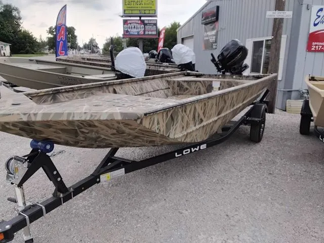 2026 LOWE RX1860DT IN MOSSY OAK SHADOW GRASS BLADES CAMO PATTERN. IT IS POWERED BY A MERCURY 60ELHPT EFI FOUR STROKE TILLER HANDLE ENGINE AND SITS ON A KARAVAN TRAILER WITH SWING TONGUE.