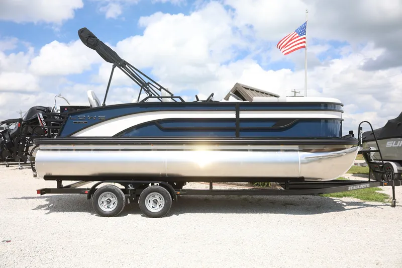 INDIGO BLUE METALLIC FENCE W/BLACK RAILS GRAY UPHOLSTERY W/BLUE ACCENTS MERC 115HP ENGINE, BLACKOUT PACKAGE CUSTOM GRAPHIC, TILT STEERING, STORABLE DINETTE TABLE W/ CUPHOLDERS BIMINI TOP W/LIGHTING-BLACK FRAME, FULL COVER/BLACK 21 ' PONTOON WAVETAMER W/LIFTING STRAKES, FULL DLX VINYL FLOOR -GRAY GPS, PREMIUM SKI TOW,1/2 BOW GATE