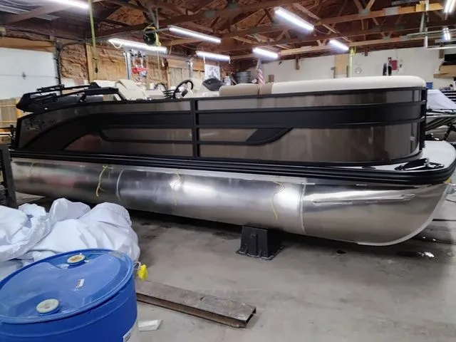 THIS BOAT HAS CARIBOU FENCE, BLACK RAILS, MATTE BLACK GRAPHIC, TAN INTERIOR AND TAN TEAK LOOK VINYL FLOORING.