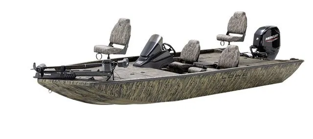 2026 LOWE ST175C STINGER IN MOSSY OAK BOTTOM LAND CAMO PATTERN WITH A MERCURY 90EFI FOUR STROKE ENGINE AND KARAVAN TRAILER WITH SWING TONGUE.