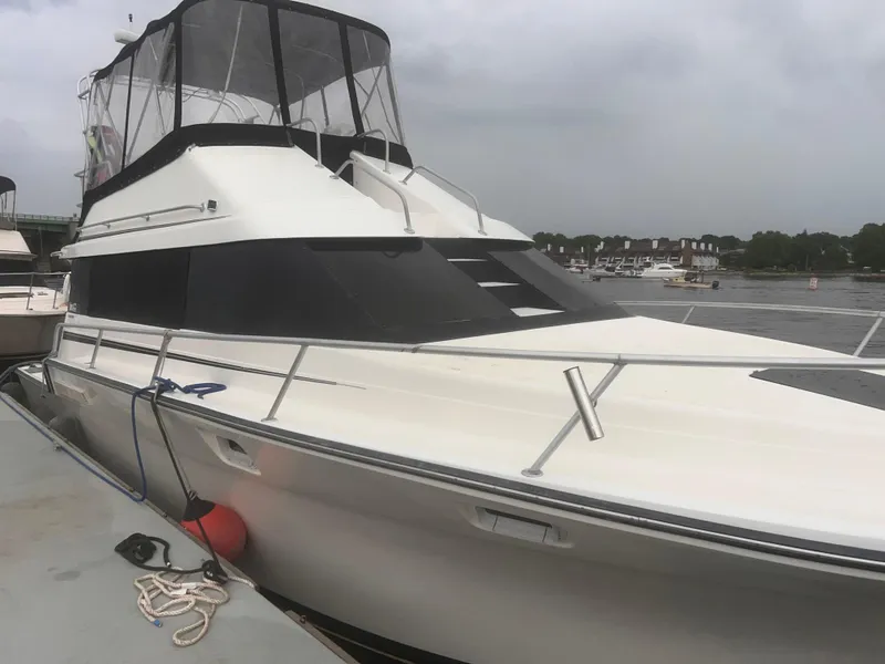 Her spacious Flybridge is a haven for anglers and cruisers featuring a 360 view, a helm bench, "wrap-around" settee starboard, rod holders, a wet-bar, and plenty of room for deck chairs. An isinglass bimini enclosure provides shade and protection from unkind weather. Easy access to the bow from the Flybridge makes bow lounging a breeze. She has a sizable Cockpit that can accommodate deck chairs, has rod holders, coaming for comfortable casting, and new Aqua Traction Flooring on deck. The swim ladder/platform offers are perfect for that much-needed dunk in the water on a hot day.