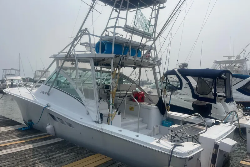 clean vessel, well maintained. she is powered by the up graded 3126 Cats, 420 hp. they have 1450 original hours. there is a full tower with controls and electronics. out riggers, center rigger, rocket launchers and rod holders .bow pulpit with bow rails side rails . and electric windlass, with anchor and rode. full enclosure , transom door and no swim platform. hydraulic engine room hatch. twin helm chairs. the interior is the fishing model with sleeping for 6. full galley, full head with stall shower. hot and cold pressure water marine A/C with heat. hot and cold pressure water. fresh and salt water washdown.