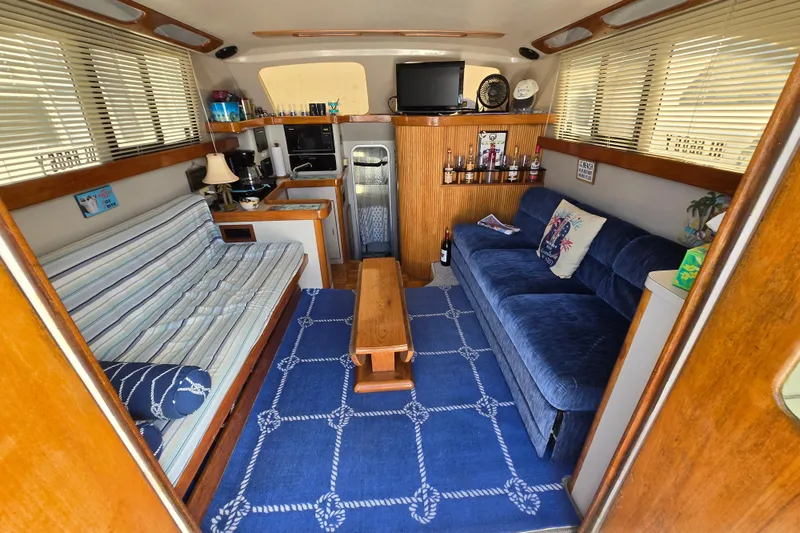 this boat has been extremely well cared for by her current owners for the past 12 years. from top to bottom it really shows well! her interior is very clean and well kept. there is a full galley and a fwd stateroom for 2. enclosed head and shower as well. her salon is quaint and comfortable. she has a full array of marine electronics to include; radar, gps, chart plotter, fish finder, vhf radio. roomy cockpit for fishing with a tuna door to land the big one! rocket launchers, spreader lights, full bridge enclosure, outriggers, bait prep area, washdowns too. air and heat. generator is not working