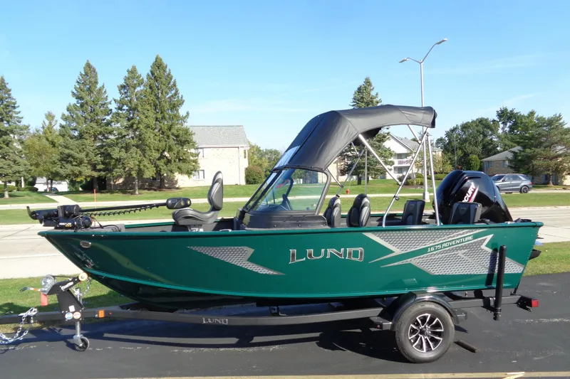 Metallic Green 1675 Adventure Sport! Powered by a Mercury 90 ELPT (EFI) Four Stroke engine. This package includes the following: Stainless Prop, Shoreland'r Bunk trailer, Spare Tire and mount, Load Guides, Transom saver, Driver's seat slide, Graphic upgrade, Two fender strap kits, Two Sport Track Brackets, Ski Pole Upgrade, Phone Charger, On the Go Rod storage, Top Hider, Splash Pan Insert, Fire Extinguisher, Kicker Stereo with two speakers, Auto Bilge Pump, Three bank onboard Minn Kota Charger, Lund Travel Cover, Sport Top, Humminbird Explorer 9 CMSI, Minn Kota Ulterra 80/MDI/WR-60'', Start Battery Two Deep cycle batteries. Freight and Prep.