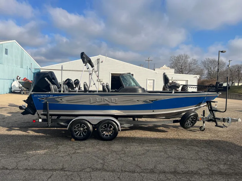 This is a 2025 Lund 2075 Impact XS that is powered by a Mercury 225 V6 4 Stroke. This boat is Blue & Silver in color with Premium Graphics Upgrade and Raised Silver/Chrome Lund Letters with Main Floor Vinyl Flooring. We have our stock boat equipped with the following options: Minn Kota 90/115 Terrova Quest MSI Bow Troller, Humminbird Helix 9 MSI G4N at console, Minn Kota 5 Bank Precision Series Onboard Charger, Luxury Package (Steering Wheel Upgrade, Ski Pole Upgrade, and Air Ride Pedestals), Lund Sport Top with Walkthru Curtain, Lund Travel Cover, and Kicker Fuel Line. The trailer is a Lund Shoreland'r Tandem Axle Bunk Trailer with Aluminum Mag Rims, Matching Spare Tire, Surge Brakes, Swing Tongue, Retractable Tie Downs, and Optional Bow Steps.