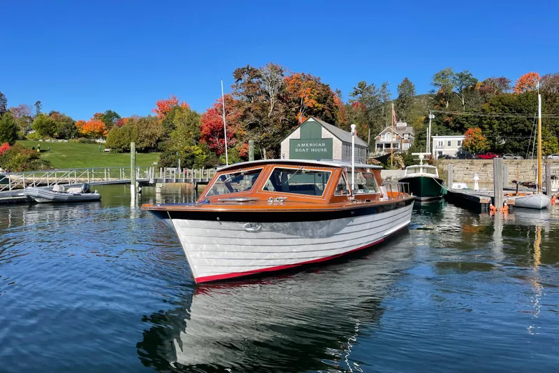 She is powered by twin Chrysler Marine V-8 gasoline inboards (215 HP each), which start easily, run smoothly, and deliver strong performance (27 Knot Cruise) for a classic wooden runabout. Her classic lapstrake hull, varnished mahogany wheelhouse, and hardtop profile offer unmistakable Lyman character, while modern navigation, electrical, and safety upgrades provide confidence and convenience underway.