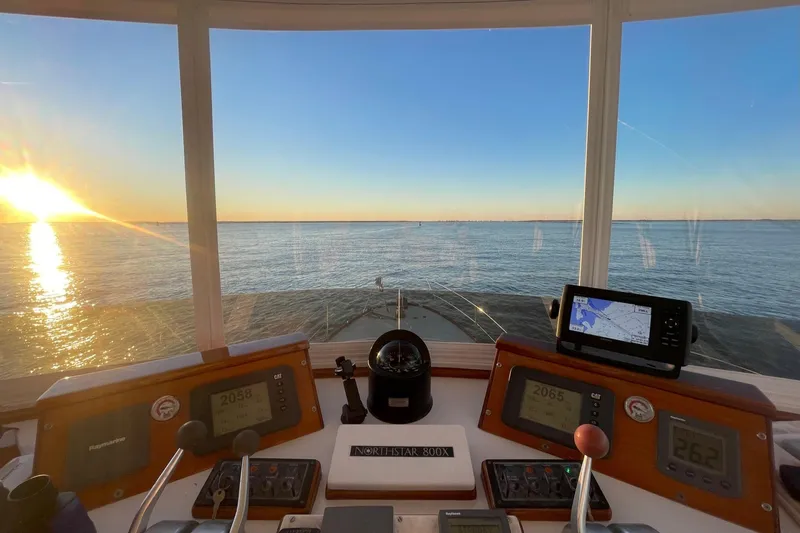 Irresistible has a fully enclosed flybridge with two pedestal seats and a "L" shape settee with table. The captains chair is centered with all the navigation and engine controls comfortable located within arms reach. There is a varnished teak helm on a Destroyer wheel.