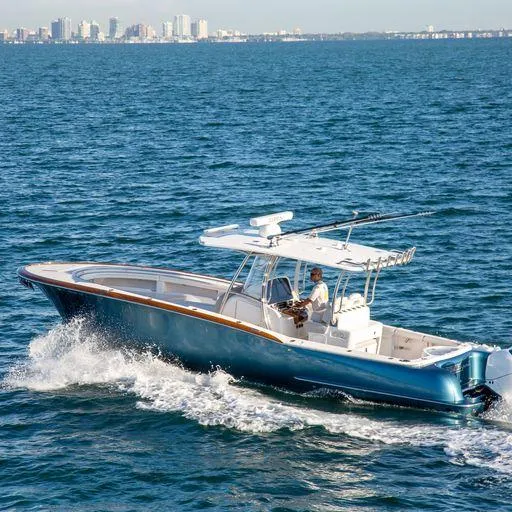Magbay 33' Center Console for the Discerning Yachtsman. A Semi-Custom Yacht Tender-Offshore Fishing Machine. Extremely Dry and Efficient. This 2019 Magbay was Completely Customized By Cay Marine to Include: Faux Finish Toe Rail and Helm Pod ~ Her Gleaming Custom By Cay Marine Metallic Blue Hull Paint Job With Metallic Grey Underside Hardtop, to Match her Mothership.