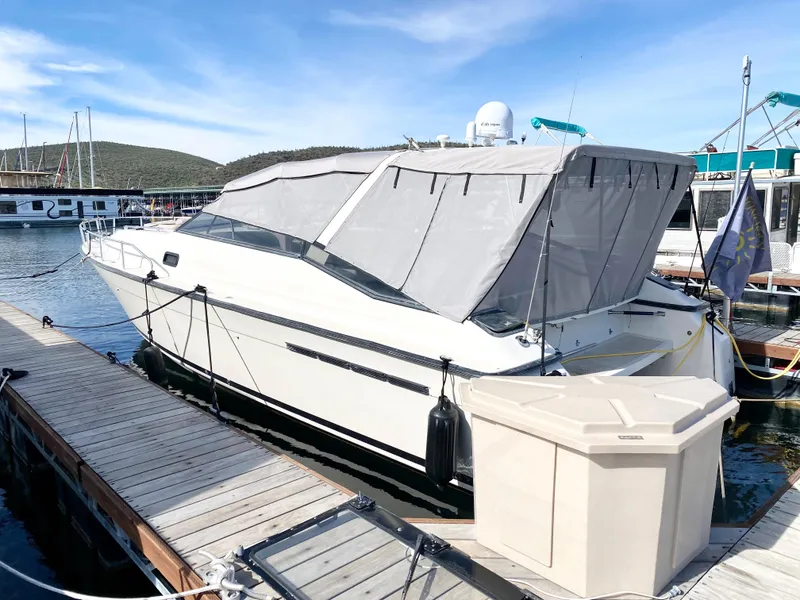 Her 50' slip is transferable at Scorpion Bay. Call for or text for the details. New in 2022 cockpit Uhpolstery, canvas and screen enclosures with additional aft bimini. She is a great weekend getaway at Scorpion Bay with views that don't stop And a huge cockpit for dockside entertaining with her flatscreen TV. The beam and profile of this vessel offers a wide open cockpit for entertaining. Her cabin consists of two private staterooms, full galley, newer flooring, and a bathroom with a separate shower. We look forward to getting you on your next boat! All photos from 2023..