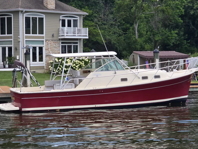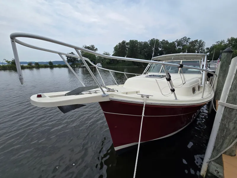 The 2001 Mainship 30' Pilot is a practical, no-nonsense boat that makes it easy to just jump on the boat and take off for a day or overnight cruise. The design takes its inspiration from the Down East style boat. She was just delivered from Hampton VA to our complimentary docks in Crownsville, for your personal inspection. She cruises at 18 mph and tops at 21 mph at 3000 rpm! (Just hauled today 9-15-2025 for bottom cleaning!