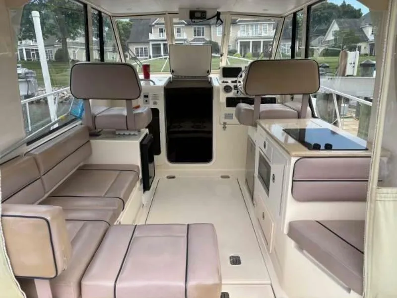 The cockpit features molded seating and storage lockers. The cockpit features a transom door for easy access to the swim platform enhancing its functionality for fishing and family outings.