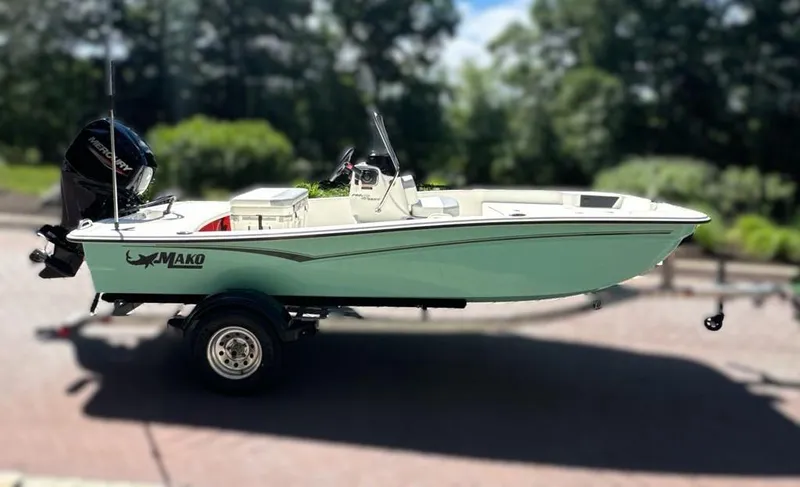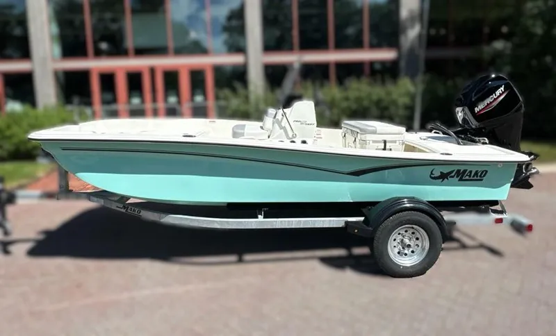 The strong design of the Pro Skiff 15 consists of the hull and deck liner that are chemically and mechanically bonded together, and then filled with expanding foam to create one unitized structure with excellent flotation and rigidity. It comes standard with a hot-dipped galvanized trailer, a Mercury outboard and the industry-leading MAKO Assurance 5+Life warranty.