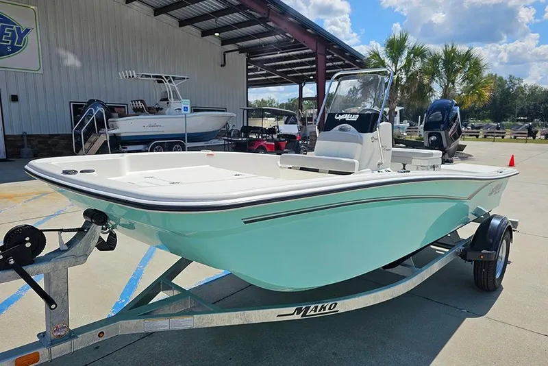 This Seafoam Mako Pro Skiff 15 CC has a MERCURY 60 ELPT 4S EFI outboard motor.