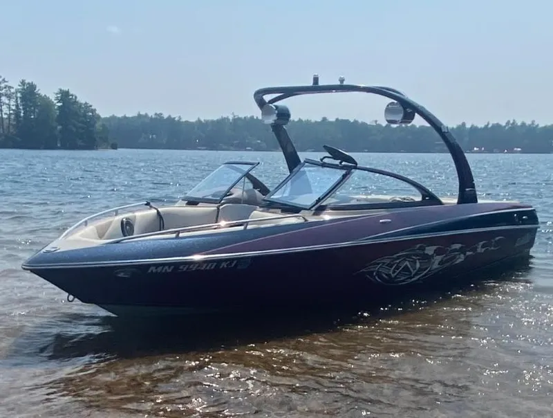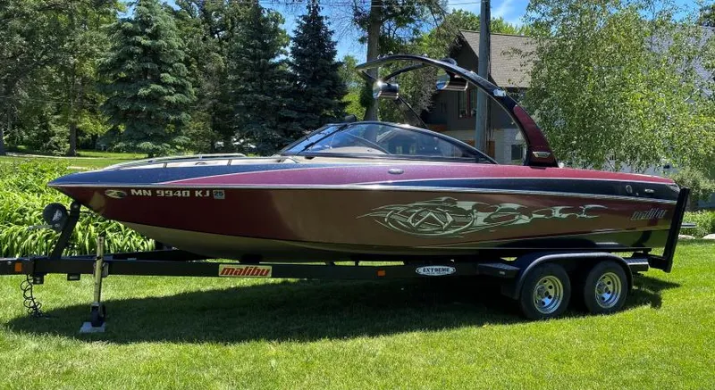 Equipped with: 5.7L Indmar Monsoon 340HP V-Drive Inboard w/860 hours, 4 ballast tanks, wake tower w/Speakers, marine stereo system w/Cockpit speakers, cruise control, bow filler cushions, towing mirror, the Malibu wedge, depth sounder, floor storage locker, custom matching tandem axle trailer, trailer guides, swing tongue, and more! This boat is in great condition and is ready to provide your friends and family with a summer of fun!