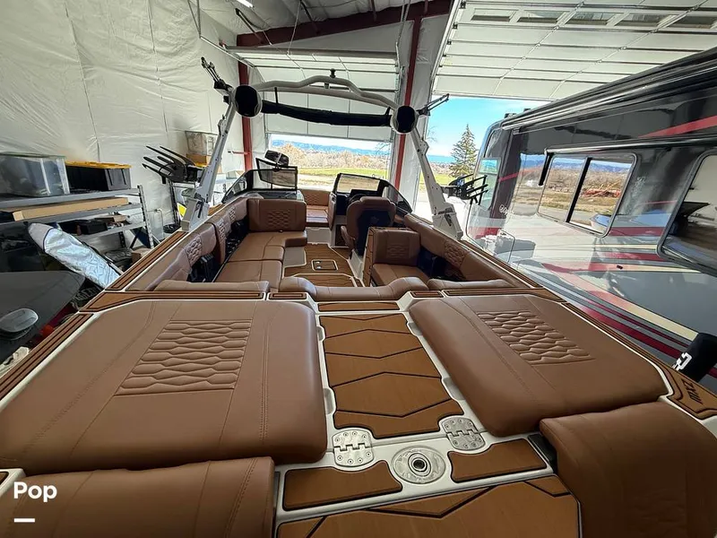 Inside, luxury meets functionality. The wraparound lounge seating, premium Wet Sounds audio system, soft-grip flooring, and massive storage compartments make every day on the water effortless. The MaxPivot seat and transom walk-through keep the crew comfortable and connected, while the stunning RGB lighting sets the mood long after sunset. With 32 cupholders available, there's no problem finding a place for your beverage.