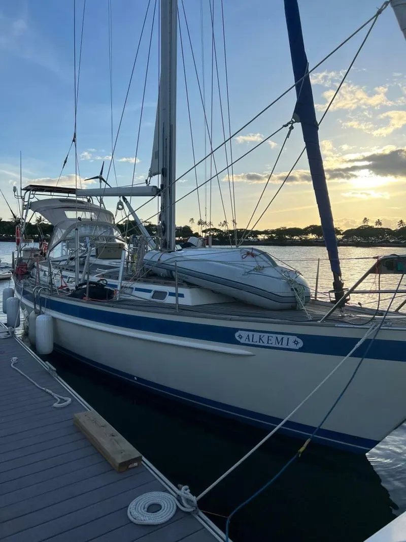 "ALKEMI" is a fiberglass constructed aft cockpit cutter rigged sailing vessel with diesel auxiliary. She has a raked bow with bow thruster, fin keel, skeg-hung rudder, and reversed transom with molded boarding platform. She has an in-furling mainmast and auxiliary power is provided by a 100 Hp Yanmar marine turbo diesel. On deck, starting forward, is a stainless steel bow railing, Harken furling unit for jib, and recessed anchor locker with enclosed electric anchor windlass. Walking aft, there is a second furling unit for the staysail and a deck hatch that opens to the forward cabin. The cabin trunk is fitted with aluminum-framed acrylic deck hatches, dorade boxes, teak handholds, flexible solar panels on top, and opening ports along the sides. The decks and cabintop surfaces have a teak overlay and there is a teak cap rail with lifeline stanchions mounted on top. All sail control lines lead aft to the cockpit. The cockpit is arranged with a pedestal-mounted wheel helm. The pedestal also supports engine throttle and gear controls, navigation electronics, and a folding cockpit table. Sail control lines lead back to the cockpit and are handled by jammer clutches and winches. The cockpit area is shielded by a wraparound windscreen and further aft is a fiberglass-covered stainless steel targa arch, then a stainless steel solar panel, and antenna arch over the transom area. The arches and windscreen support Sunbrella awnings. There is a wind generator on a stainless steel post located at the aft port corner. A centerline gate in the stern railing leads down to the molded boarding platform with built-in seats on each side and a centerline swing- down boarding ladder.