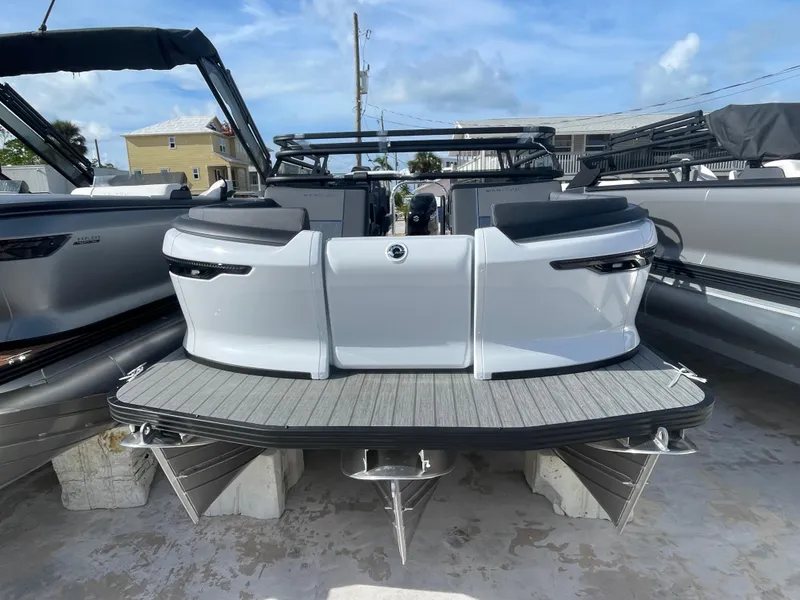 The Explore 22 Switchback with Trifold Bench features a portside switchback lounger with navigator helm. With max capacity, there's room for up to 11 people. This model can be rigged with your choice of a traditional outboard engine. Suzuki DF250APX5