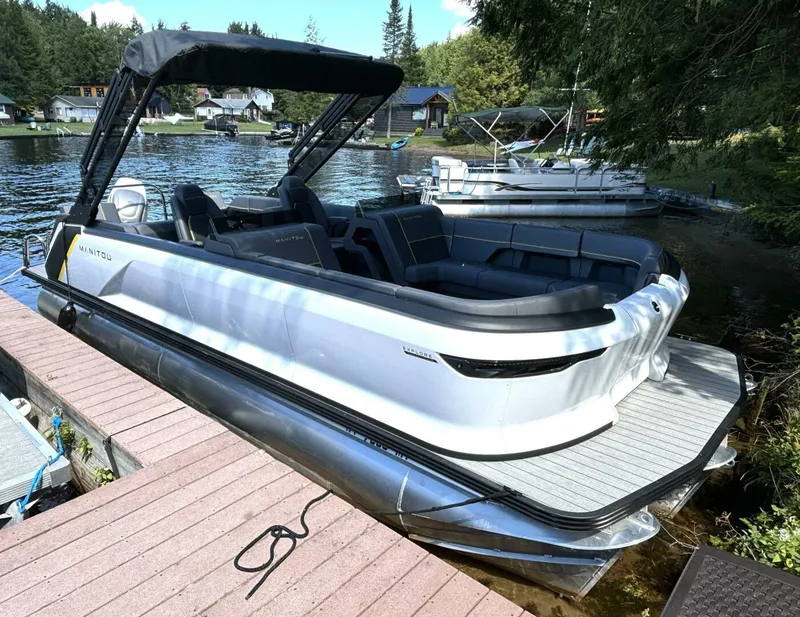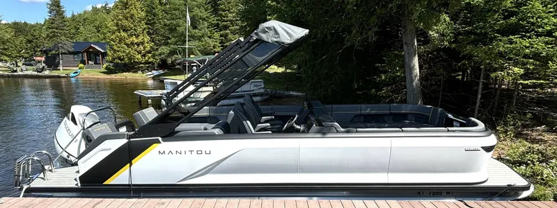 This 24 foot Manitou Navigator is virtually brand new and shows like it! Beautiful condition with only 22 hours on the maxed out 300HP Suzuki outboard. This is a one owner fresh water only vessel and has been meticulously cared for. Simple yet very refined will full attention to detail given by the manufacturer. From the premium flooring and fully adjustable seating, to the ample storage and upgraded electronics, this is a joy to drive and be driven on. Plenty of space for up to 13 passengers, feel free to lounge out on the aft bench seat or rearrange into a 2 seat area with entertainment table. Move about the center walk-through cockpit freely and access the water easily via bow and stern gates. Dedicated swim platforms are also available at both ends. When you want a little shade and protection from the elements, pull out the gas assisted 12 foot sport bimini and crank some tunes through the Fusion RA-210 stereo. Find your way easily and reliably to the next sandbar every time with the built in 9" Garmin touchscreen display. This truly is a gorgeous vessel and you will save thousands off new, which this pretty much is!