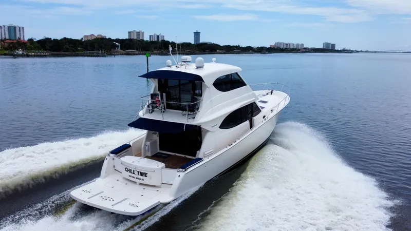 "Chill Time" is a 48 Maritimo with several desirable recent updates and services. The large beam provides a spacious layout with amenities and room below comparable to many larger yachts.