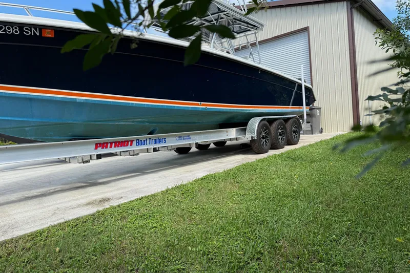 The boat rest on a Patriot Triple axle trailer brand new condition, rated at 18000# triple axle disc brakes. Mag wheels with 16" tires.