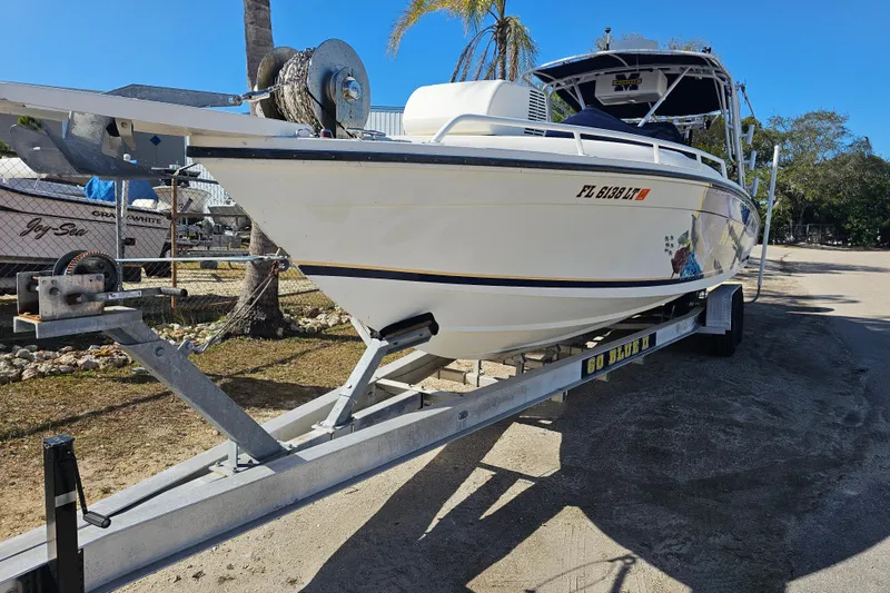 She is agile, fast, and ready for action. Built tough to the highest standards. Center console with aluminum Powder Coated arch T-Top with outriggers. New full cockpit cover. Built into the leaning post is tackle storage and a large Yrti cooler with seat cushion. Forward of the console is a vee berth cabin with Porta Potty head and 110 v Air conditioning. Large dash contains plenty of electronics including Newer Dual screen Garmin 7610 color GPS, Fishfinder, Radar, Garmin Autopilot, VHF radio, HD trim tabs, EZ Anchor puller with 35 feet of Stainless chain and rode. two livewells, fresh water washdown. . Excellent 360 degree fishability. Runs and looks great.