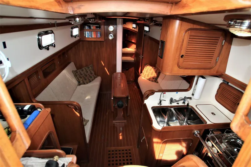 The main cabin features two cushioned settees, one to port and one to starboard. On centerline is a fiddled teak drop-leaf dining table that seats four. The dining table has an illuminated Ritchie B80 Series compass mounted on its aft facing leg. Each settee has two lockers with louvered doors separated by a fiddled open locker above the backrest cushion, as well as three additional storage lockers behind the backrest cushions. The cushions have zippered, removeable Sunbrella slipcovers with new foam in 2019. A small locker with a louvered door is located just above the cabin sole, in the starboard settee bulkhead