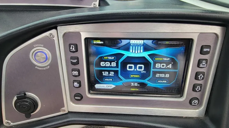 Awesome shape with 6000GDI 430hp with only 220hrs!, well equipped with bimini top, cover, fusion stereo with 2 amps, subwoofer, and 4 tower speakers, pull up cleats, rear seat changes to wake view seat, removeable decadence floor, dual batteries, 2 clamping style board racks, and custom tandem trailer with larger wheels, chrome wheels, swing tongue, diamond plate, and built in tie down straps