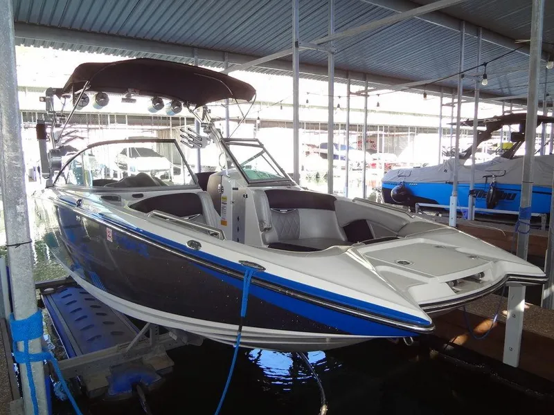 Ilmor 7.4liter MV8 522hp inboard with V-drive 495 freshwater hours. Includes X-series spring loaded wakeboard tower with folding racks, bimini canvas and canister speakers, fiberglass swim platform, pick-forked bow with swim ladder, bow seating with arm rests, walk-through wind screen with aluminum billet folding breeze way door, dual batteries with digital ProMariner battery charger, fill-drain ballast system with surfer presets, color helm operating screen, full-blown audio system. Transferable slip lease available at Northshore Marina on Lake Travis.