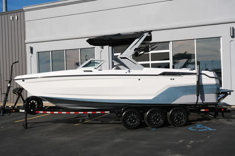 The 2026 MasterCraft XStar 25 represents the pinnacle of luxury, performance, and innovation in the world of wake boats. Finished in White with COASTAL BLUE Flake and accented by SILVER Satin badging, this build makes a bold statement both on and off the water. Inside, the CoolFeel STEALTH GREY interior with Heathered Charcoal trim and detailed stitching creates a refined, upscale atmosphere for every passenger. Powered by the Ilmor 6.2L GDI VD 2.1 Supercharged engine, this XStar S25 delivers relentless performance with precision handling, enhanced by hydraulic steering, tracking fins, and a proportional stern thruster for effortless maneuverability. SurfStar technology with FastFill ballast ensures an unrivaled surf experience with customizable waves at the touch of a button. The Z100 tower features a premium bimini in white, clamping XL board racks, and a full tower audio package with sound pods, all controlled through the dual-screen Command Center with mAX. Comfort amenities include heated helm and observer seats, a refrigerator, Murphy seat, bow filler cushion, heater, and transom lounge seating-making every outing a premium experience. Additional highlights include RGB accent lighting, underwater lighting, docking lights, stainless fender clips, panoramic XStar mirror, and aft/transom shade systems. A triple-axle trailer in Midnight Black with XD820 Black Machined wheels ensures secure transport in style. This XStar25 is the ultimate combination of performance, luxury, and design-crafted for those who demand the very best