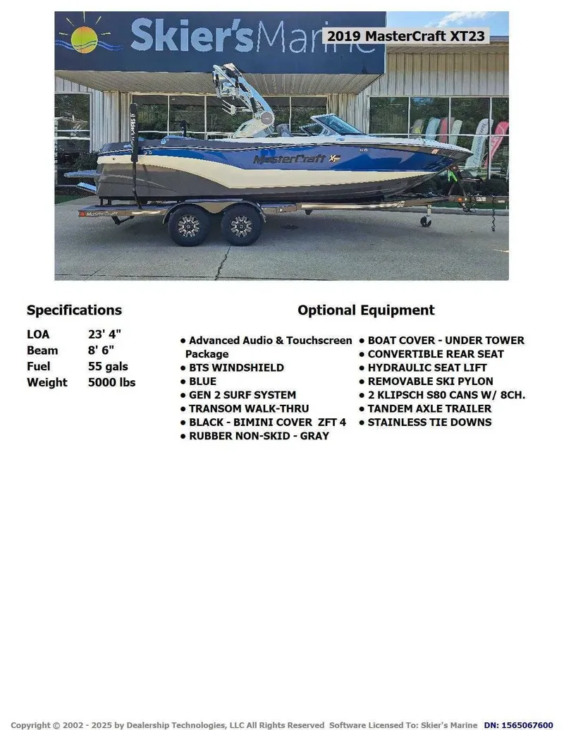 2019 MasterCraft XT23, The 2019 MasterCraft XT23 is a 23-foot towboat designed for all-around wakesports. It features the Gen 2 Surf System and a massive ballast capacity, allowing riders to create customizable wakes and waves for wakeboarding, surfing, and skiing. Its spacious interior and U-shaped lounge provide comfortable seating for up to 16 people. Powered by a Ilmor marine engine, the XT23 offers a blend of performance, versatility, and style.