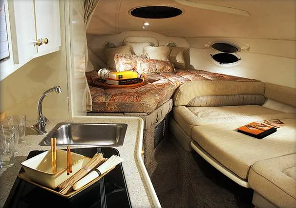 The Maxum 2700 SCR helm includes a burl grain instrument panel, a VHF radio, a depth finder, and a Danforth compass. The cockpit lounge features a cooler and a removable table, while distinctive elliptical portlights invite the sun and breezes into the main cabin. Molded cabin entry with sliding cap provides easy access to the bright and airy cabin. The radar arch adds function to style with lighting and sound system speakers built in. Galley appliances are selected with quality, ease of use, and efficient operation in mind. The galley offers a two-burner stove and a Norcold refrigerator. The head was planned to provide optimum lighting and maximum space. Stereo speakers are placed for ultimate sound quality.