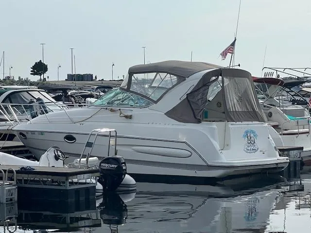 Powered with Merc. 7.4 MPI with 709 hours and Bravo 3 drive. Black bottom paint, cockpit cover, camper canvas, trim tabs, vhf, ac/heat, dual batteries with switch, fridge and hot/cold pressure water. Auto bilge, swim ladder, side dinette, microwave, stove top, in dash depth finder and compass. New engine coupler & bellows 2025 .