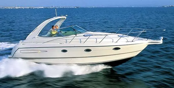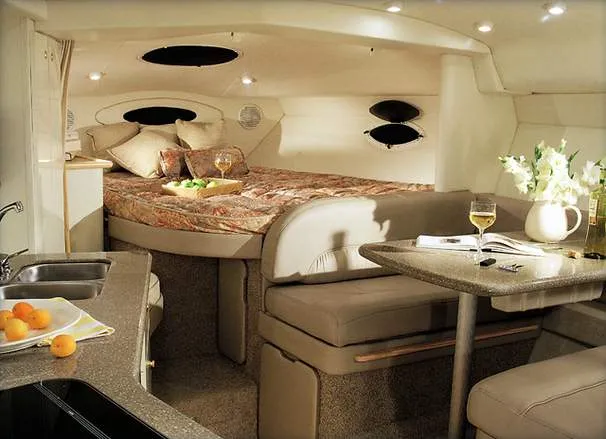 The Maxum 3300SCR is for those who demand both quality and performance. Maxum's flagship cruiser has a wraparound console embracing a helm equipped with an impressive complement of instruments in an ergonomically designed console. A cockpit wetbar invites spontaneous celebration. The spacious galley of the 3300SCR has hardwood floors, berber-style carpet, rich Corian countertops, and designer fabrics. Entertain with panache from a gourmet galley, and fall asleep in a moonlit berth. The salon features a dinette lounge seat with an adjustable height, high - low Corian tabletop.