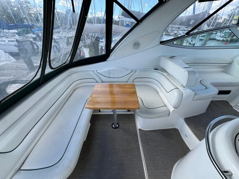 Cockpit & Exterior: Designed for entertaining, the cockpit layout is among the largest in her class. • Wet Bar with sink. • U-shaped seating with a removable table. • Double-wide helm seat and portside lounger. • Full camper canvas with clear isinglass for weather protection. • Molded steps to walk-through windshield for easy bow access. • Large (extended) swim platform with integrated ladder and transom storage.