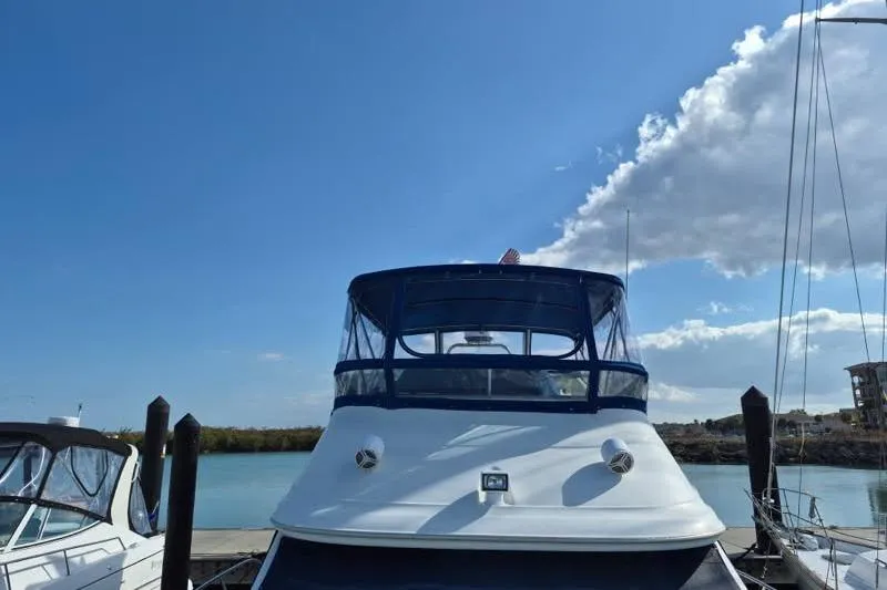 A low-cost yacht whose sporty styling and spacious interior appealed to value-conscious buyers, the Maxum 4100 SCA was considered a lot of boat for the money when she came out in 1997. Construction is solid fiberglass, and with a published weight of just 30,000 pounds, the 4100 SCA is a relatively light boat for her size. The two-stateroom interior of the Maxum 4100 is arranged with the galley down and a midlevel dinette forward of the salon. Walkaround queen berths are found in the both staterooms, and the forward head has a circular shower stall while the head and shower units in the aft stateroom are separate. On deck, molded steps lead from the aft deck down to the swim platform, and the flybridge has guest seating forward of the helm along with a wet bar and a triple helm seat. Additional features include cherry interior trim, wide side decks, and an aft-deck hardtop with wing doors. 370hp Cummins diesels cruise at 20 knots and reach a top speed of around 22 knots.