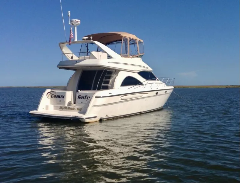 The 4600 SCB Maxum was manufactured from 1997 thru 2001, roughly 5 model years. This is the two stateroom model with private heads and a raised dinette. The galley is large and perfect for entertaining with plenty of counter space, stove, oven, new refer, microwave oven and coffee maker. She is equipped with twin heads with showers, crew quarters with 2 single bunks and large stateroom with midline queen and private head entrance. The flybridge is easily accessed via staircase and has a complete enclosure to protect against inclement weather. There is plenty of seating for sundowners, large, comfortable helm seating and ergonomically placed controls and instruments.