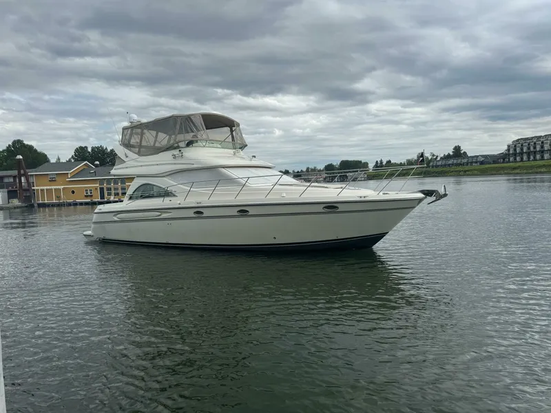 THIS YACHT IS IN EXCELLENT CONDITION, IT HAS ALWAYS BEEN USED IN FRESHWATER AND SHED-KEPT SINCE NEW. IT FEATURES TWO STATEROOMS AND TWO HEADS, EACH WITH STALL SHOWER. THIS YACHT HAS THE PREFERRED DINETTE OPTION OPPOSITE THE "UP" GALLEY TO PORT. THE SALON HAS A BUILT-IN ENTERTAINMENT CENTER WITH A CURVED SOFA TO STARBOARD. A LARGE CURVED GLASS SLIDING DOOR OPENS TO THE AFT DECK WITH A TRANSOM WALK-THROUGH DOOR AND A HUGE SWIM PLATFORM. THE FLY-BRIDGE HAS BUILT-IN SEATING WITH A WET BAR AND FULL CANVAS WITH ISINGLASS ENCLOSURE.