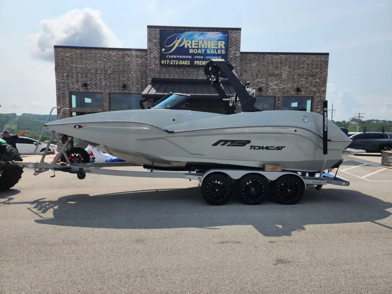 STRIKING APPEARANCE Step up to the Tomcat F24 and you realize this is no normal 24' wake boat. The sweeping high sides, distinct inset lines, and transom seating provide a unique experience that exceeds expectations. ROOM FOR EVERYONE Whether you're out with a few friends, the whole family, or the whole crew, the F24 has room for everyone. With a wide square bow, cockpit bench seating, rear flip bench seating, and rear facing built-in seating, the interior of the Tomcat F24 has room for everyone.