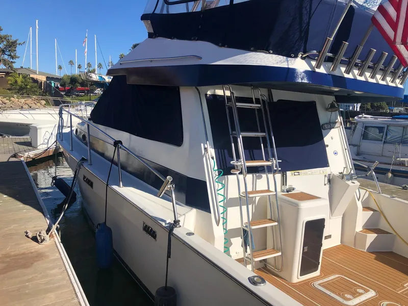 The Mediterranean with its deep V hull, provides performance and safety demanded by knowledgeable yachtsmen and serious sport fishermen. The engine room of the Mediterranean 38 is a testament to attention to detail. The compartment is a mirror smooth fiberglass engineered structure that incorporates fiberglass drip pans under the engines and fiberglass battery boxes with lock-down hinged vented covers.