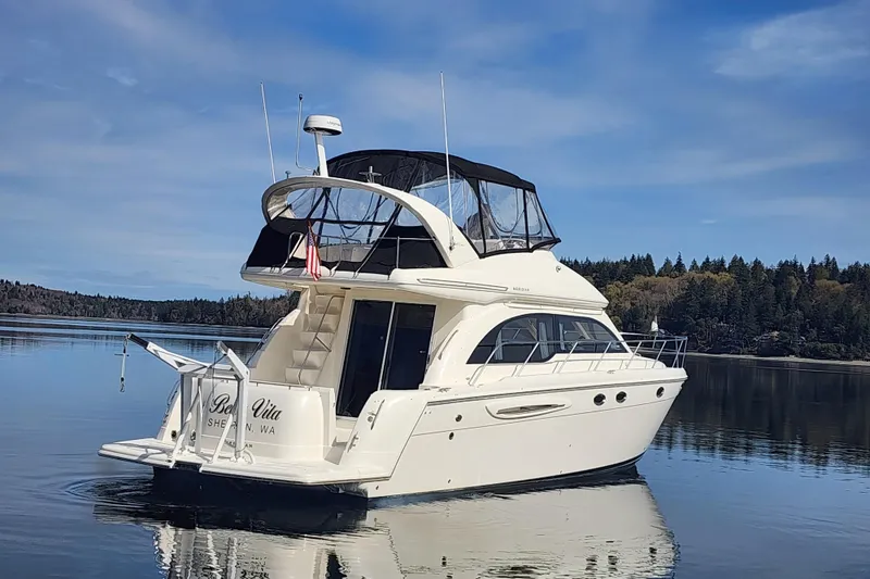 A STUNNING BOATHOUSE KEPT 411 MERIDIAN!! THIS VESSEL IS VERY CLOSE TO A BRISTOL VESSEL! WITH TWIN 370 HP CUMMINS DIESEL, BOW AND STERN THRUSTERS, NEW RAYMARINE TOUCH SCREEN ELECTRONICS AT BOTH UPPER AND LOWER STATIONS WITH NEAMA BACKBONE SYSTEM, DIESEL FURNACE SYSTEM AS WELL AS AC REVERSE AIR SYSTEM, NEW DRIPLESS SHAFT LOGS, 1000# OLSSON POWER DAVIT ON SWIM STEP WITH NICE CENTER CONSOLE HB INFLATABLE WITH 40HP YAMAHA AND MUCH MUCH MORE!!!